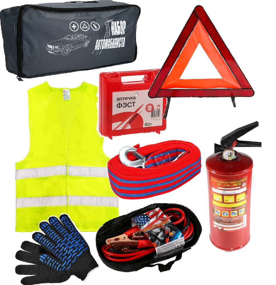 НАБОР автомобилиста 7 предм. (аптечка/огнетуш-ль/трос 5т/знак/провода/жилет/перчатки)
