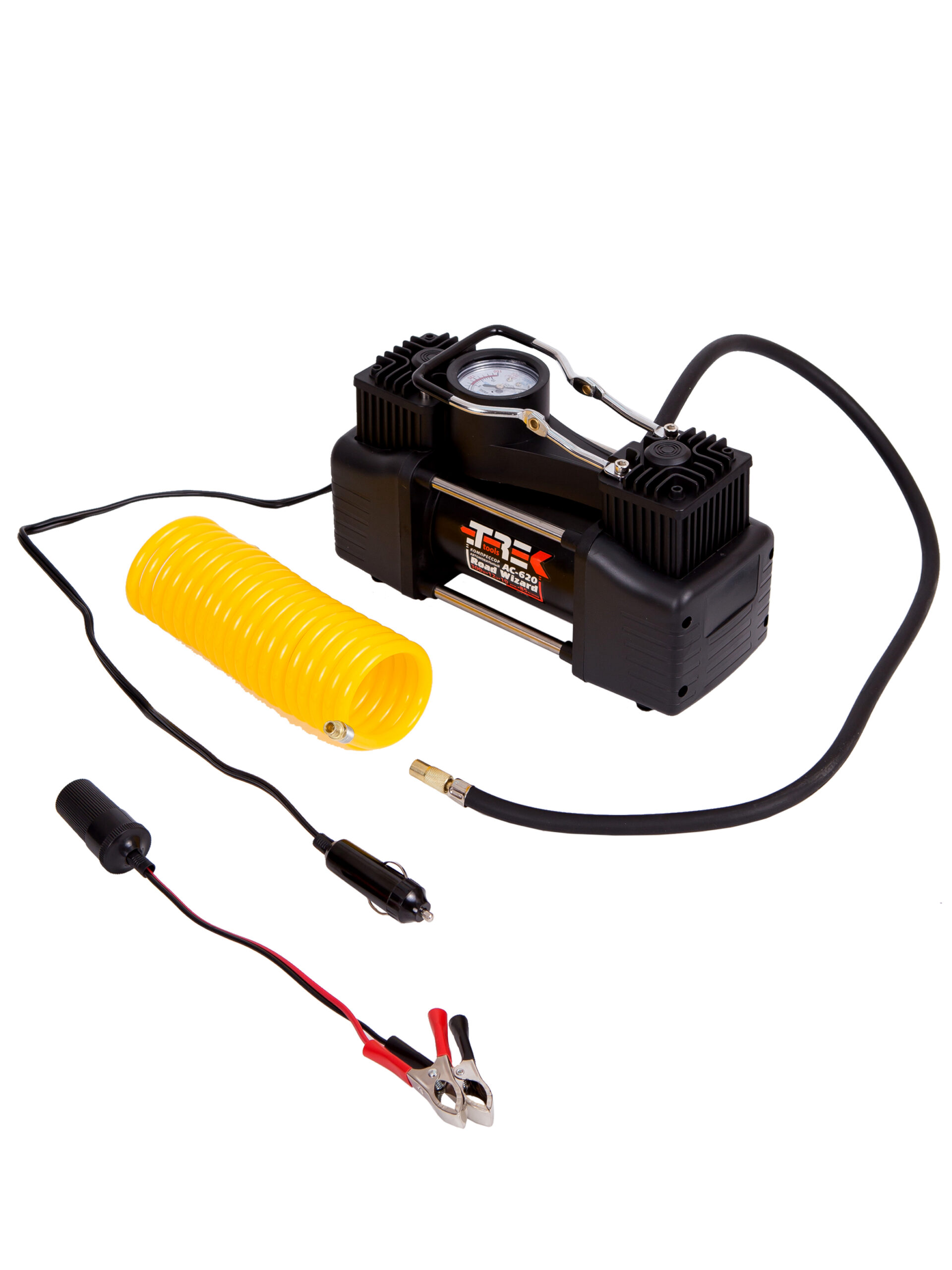 Компрессор «TREK» 620, 90 л/мин, предназначен для накачивания колёс автомобиля, квадроцикла, велосипеда, гироскутера и любой другой техники. Насадки (3 шт) с помощью которых можно накачать: мяч, тюбинг, круг для купания и многое другое.