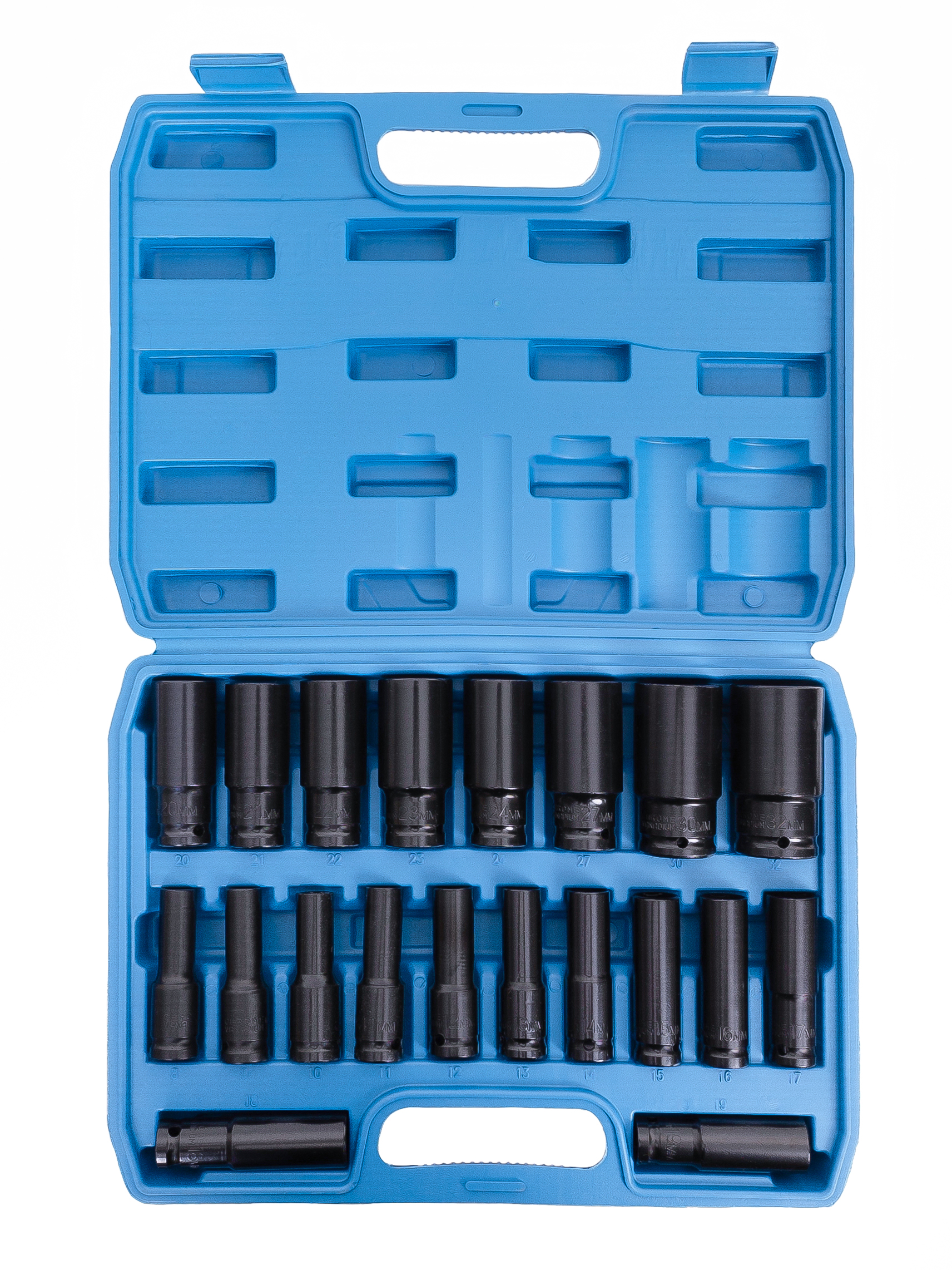 Торцевые головки, удлинённые 1/2″ (8-32 мм) в компактном, удобном кейсе.