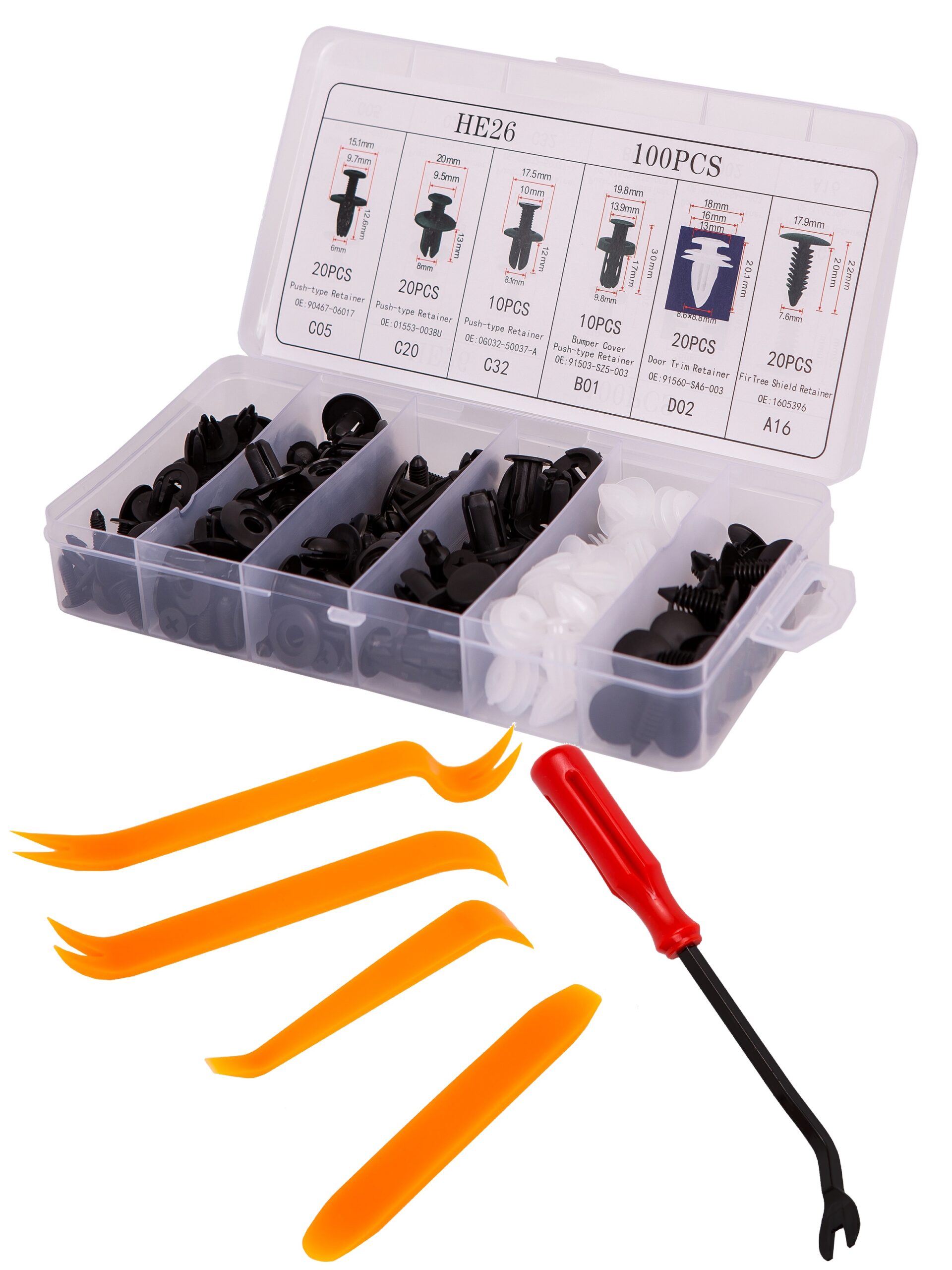 В состав универсального набора входят 100шт различных клипс в удобном кейсе + лопатки-съёмники клипс 5шт: