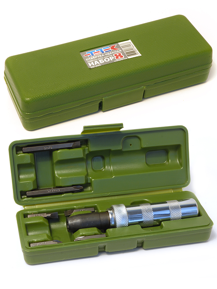 Ударная отвертка с набором бит в кейсе (8 предметов) служит для прочной фиксации и откручивания специальных винтов. Комплект поставляется в компактном пластиковом кейсе.