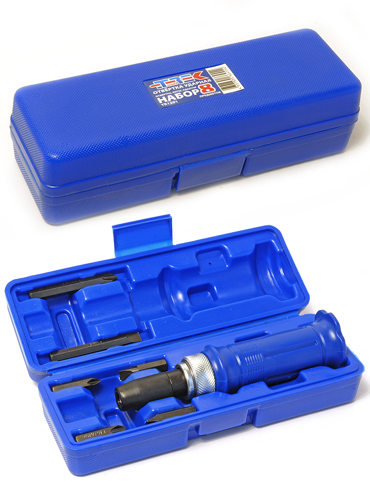 Ударная отвертка с набором бит в кейсе (8 предметов) служит для прочной фиксации и откручивания специальных винтов. Комплект поставляется в компактном пластиковом кейсе.
