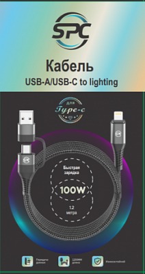 | _Краткое название для печати на упаковке | Кабель зарядки с переходником SPC USB-A/USB-C to lightning (айфон), 100W, 1,2м, черный |